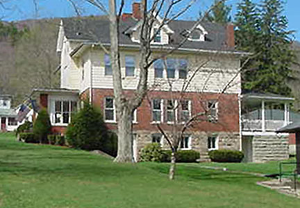 This postcard is a tinted photo of the rectory and the side lawn of the church. The man in the photo was probably the priest of the church at the time. Some of the priests that have ministered there are Father Bertii, Burns, Coady, Mannigan, Pattison, Galligan, Flood, Cosgrove, Geddes, Marconi.