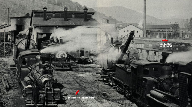 "Six locomotives, four loaders, and the combination car huddle around the roundhouse at Norwich. Identification of the locomotives is not positive, but it appears that the one on the left is either G. L. Co. No. 16 or No. 18, the engine in the center is No. 21, and the engine at the right is probably G. L. Co. No. 19, renumbered 6 on the Potato Creek. Except for minor repair work, the locomotives did not enter the three stall roundhouse. In the back of this building was the major repair shop were the cars, loaders, and locomotives recieved most of their overhauls."