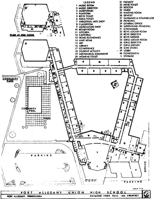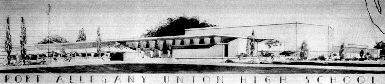 community. The Port Allegany High School was built where the separate wings for Senior and Junior High students relate to joint use facilities such as the shops, cafeteria, library, and auditorium. The gym is placed next to the pool for summer use of locker rooms. Noisy activities face away from the study places and there is public access to any major facilities without having to enter classrooms. The High School was built in 1954 and was given additions in 1962. In 1954, the construction costs (contracts) was $907,994 with a student capacity of 638 students. The area was 70,960 square feet. Then, in 1962, 16,600 square feet more was added on, giving the high school a final student capacity of 839 students. The final cost was $l,421,917. |